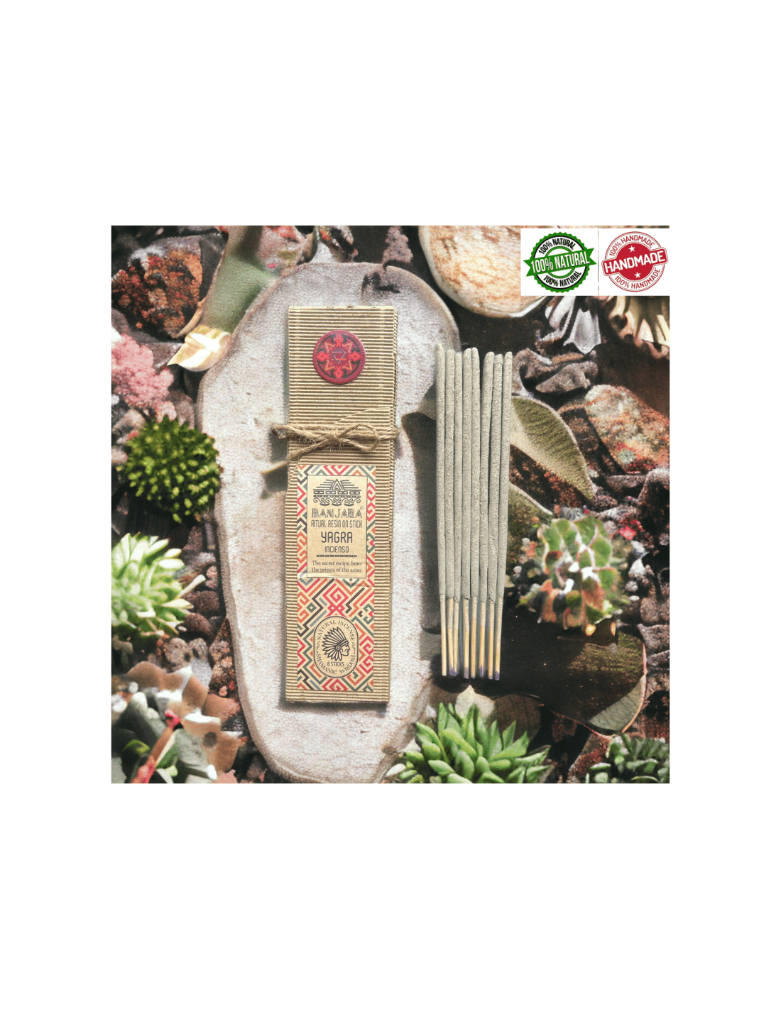 I bastoncini di incenso Banjara Aztec Ritual Masala sono prodotti artigianalmente con ingredienti 100% naturali, realizzati con la tecnica Masala, dove gli incensi vengono prodotti artigianalmente come da antica tradizione, miscelando polveri lignee e vegetali come resine, erbe, radici e cortecce, fiori, oli essenziali e miele. Questa preziosa amalgama viene poi arrotolata su bastoncini di bamboo ed essiccati all’ombra per creare i bastoncini d'incenso, o compattata fino ad ottenere la forma dei coni.